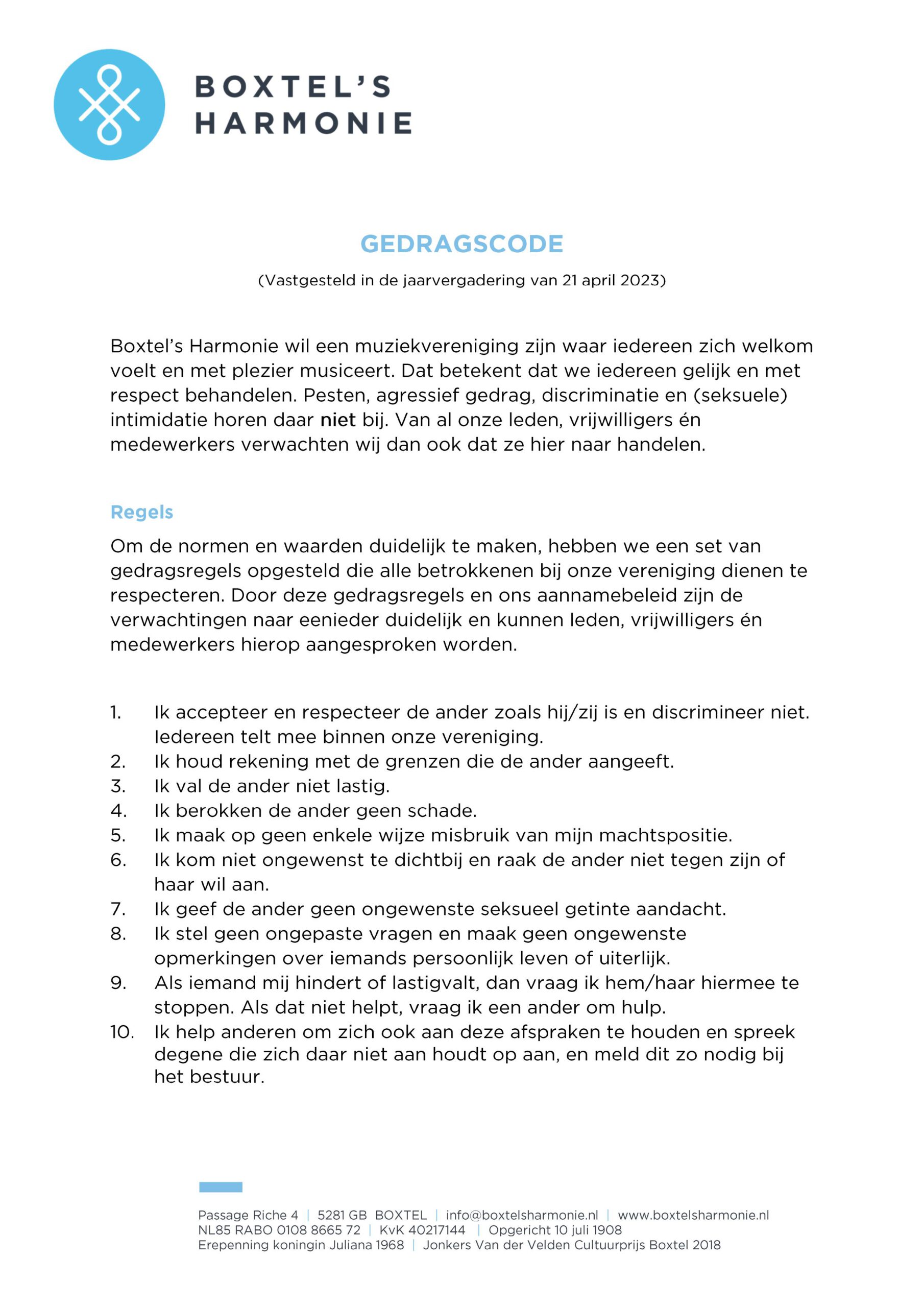 Muziekvereniging Boxtel’s Harmonie biedt jong en oud een plezierige vrijetijdsbesteding. Met respect (klik op: gedragscode) voor elkaar wordt op uiteenlopende wijzen en in diverse bezettingen mooie muziek gemaakt. Muziek die telt en vértelt, in alle toonaarden, van klassiek tot modern. Dat vergt oefening en dus wordt wekelijks gerepeteerd in Muziekhuis Boxtel, dat mede dankzij een grote dosis zelfwerkzaamheid in 2016 tot stand kwam.