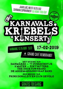 Op zondag 17 februari om 13.15 uur start voor de 42e keer het Karnavals Kriebels Konsert in de zaal van Grandcafé Rembrandt. Dit festijn staat al jaren bekend als Dé ‘carnavalsopwèrmer’ van Indegat. Live blaasmuziek en kolderachtige activiteiten staan hierbij centraal. Het evenement wordt georganiseerd door De Aggemarvanhuisaf Band Boxtel. Danmârzo, Dweilorkest Overschotje, 8maten, pintvatters en Ducktownband Boxtel zullen hun muzikale kwaliteiten laten horen. Traditiegetrouw zal ook Zijne Doorluchtige Hoogheid Prins Donald V van Eendengat en zijn gevolg deze carnavalsmiddag bezoeken. Het evenement is voor iedereen gratis toegankelijk.