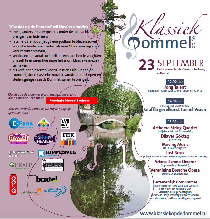 Ponton Dommel (nabij Zwaanse Brug) Prins Hendrikstraat, BoxtelOns koperkwintet Just Brass is een van de deelnemers aan de eerste editie van dit concert dat wordt verzorgd vanaf een drijvend podium op de Dommel. Het ponton ligt nabij de Zwaanse Brug. De zittrappen op de oever van de Dommel achter lunchroom Meneer van...