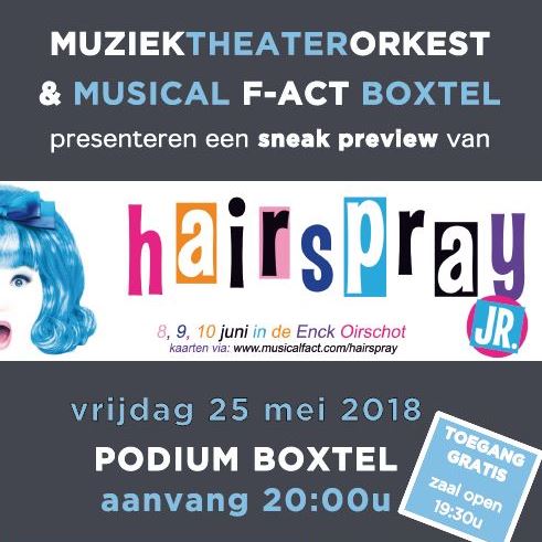 Muziekleerlingen van Boxtel's Harmonie, Gildenbondsharmonie en musicalschool F-Act voeren samen een sneak preview 'Hairspray JR' op. De toegang is gratis.